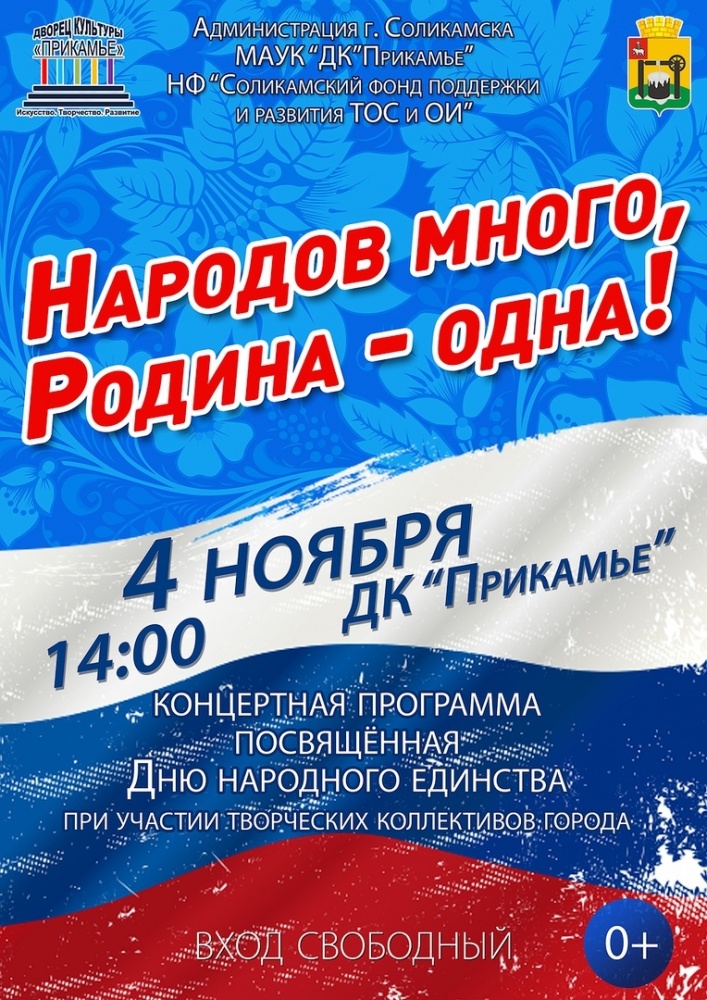 В 2018 году 4 ноября приходится на воскресенье. В этот день в ДК Прикамье пройдет концертно-игровая программа «Народов много-Родина одна!»