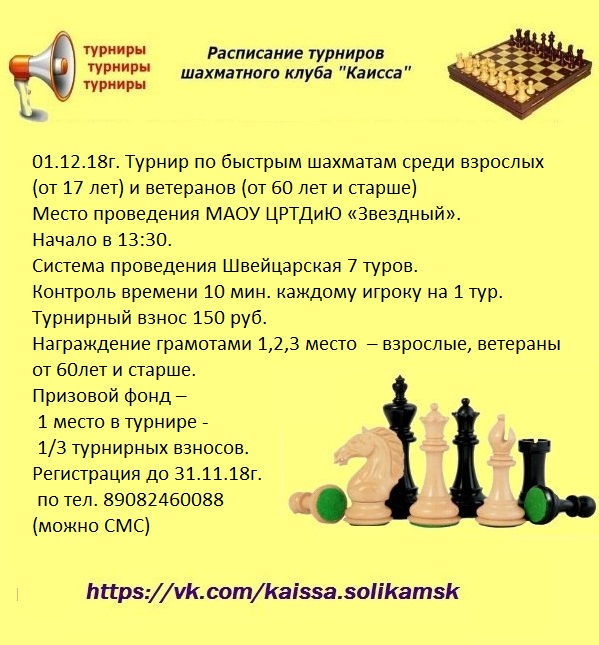 1 декабря 2018 будет проводиться открытый турнир по быстрым шахматам.
