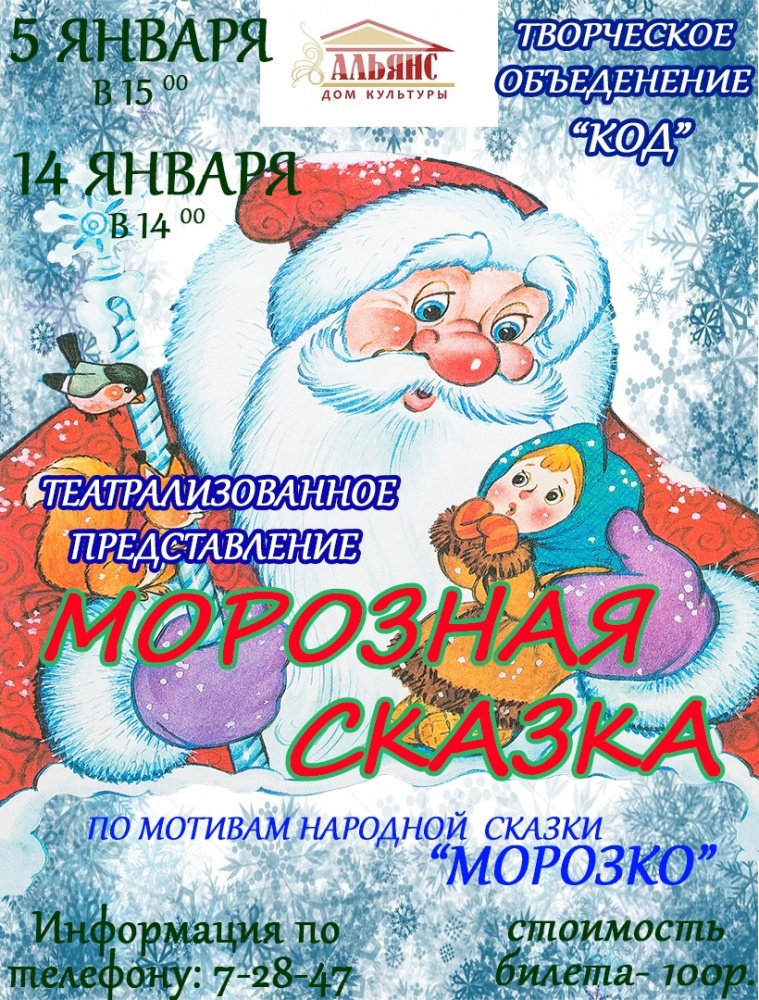 5 и 14 января 2019 ДК «Альянс» приглашает на театрализованное представление «Морозная сказка» по мотивам сказки «Морозко».