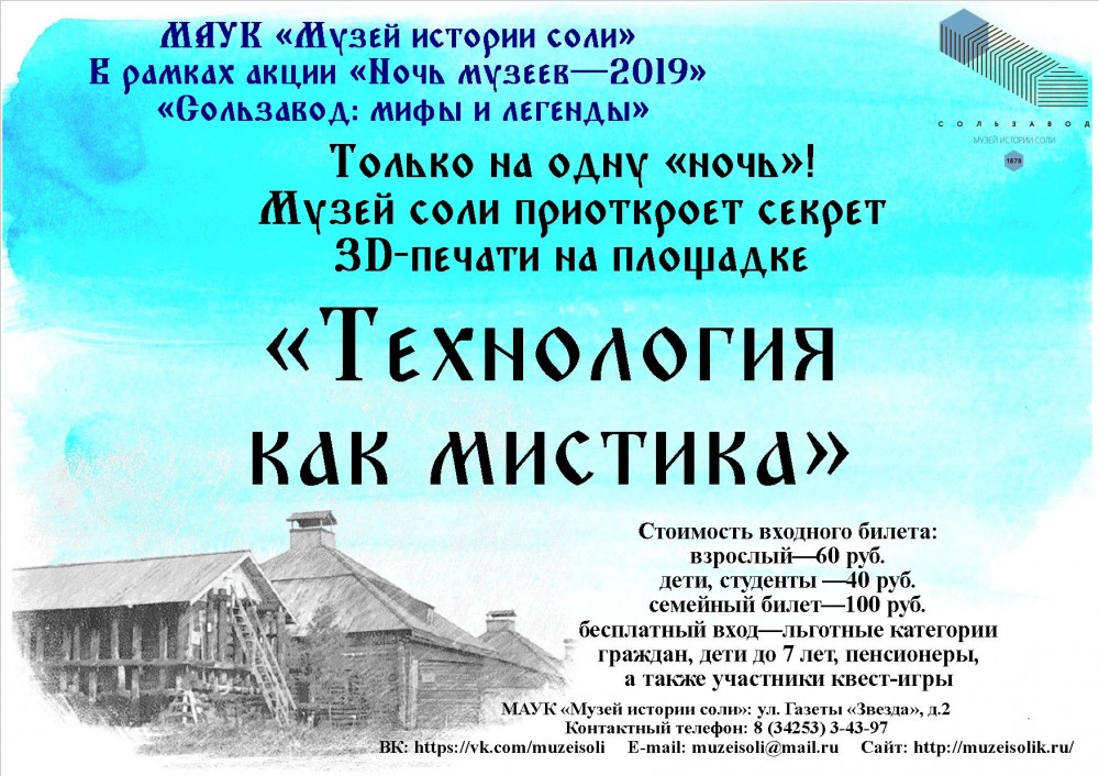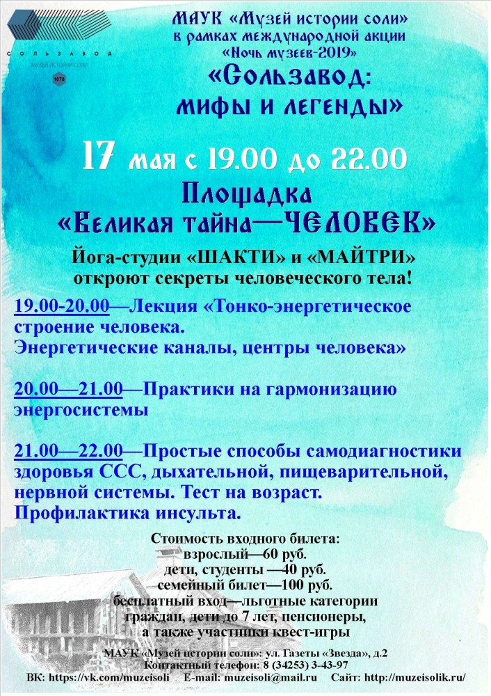 17 мая, с 19:00 до 22:00, Музей истории соли присоединяется к Ночи музеев-2019 с акцией“Сользавод: мифы и легенды”.