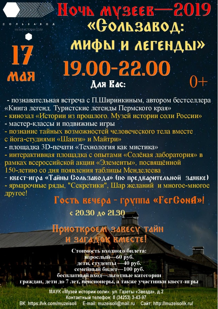 Вас ждут интересные встречи и события, квест-игра “Тайны Сользавода”, экскурсии, мастер-классы и многое другое! Гость вечера – группа ” FerConA”!