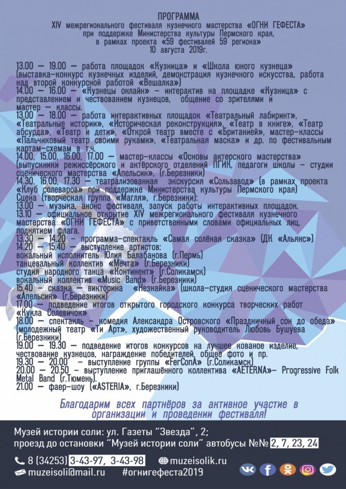 В 2019 году фестиваль «Огни Гефеста» пройдёт в четырнадцатый раз при поддержке Министерства культуры Пермского края в рамках проекта «59 фестивалей 59 региона» и приурочен к Году Театра под общим названием «Фестивальное закулисье».