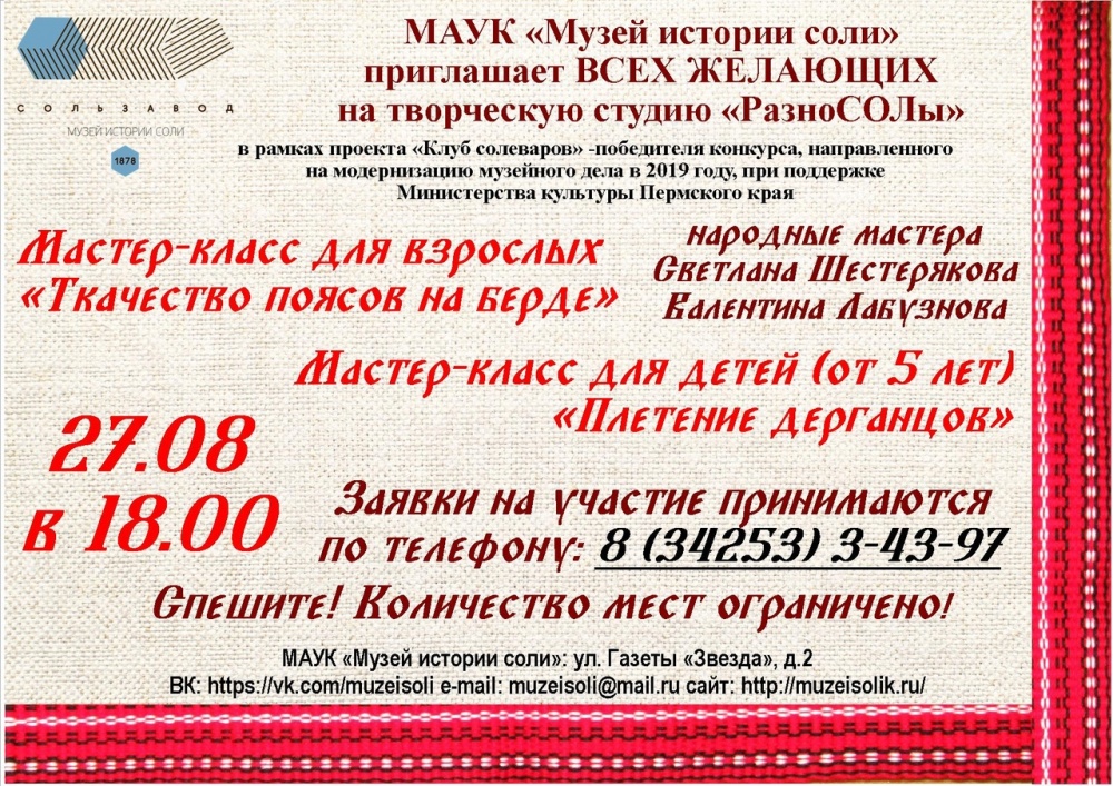 27 августа в 18:00 в Музее истории соли народные мастера Светлана Шестерякова и Валентина Лабузнова проведут мастер-классы: