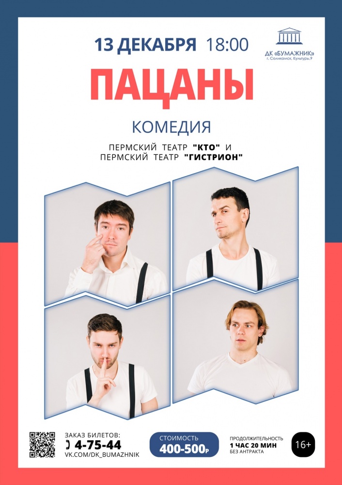 13 декабря в ДК Бумажник Пермский театр «Кто» и Пермский театр «Гистрион» представят комедию «Пацаны».