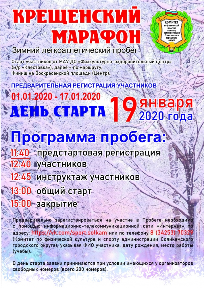 19 января 2020 состоится традиционный зимний легкоатлетический забег «Крещенский марафон». Старт участников от МАУ СН «Физкультурно-оздоровительного центра» (м/р «Клестовка»), Финиш на Воскресенской площади (Центр).