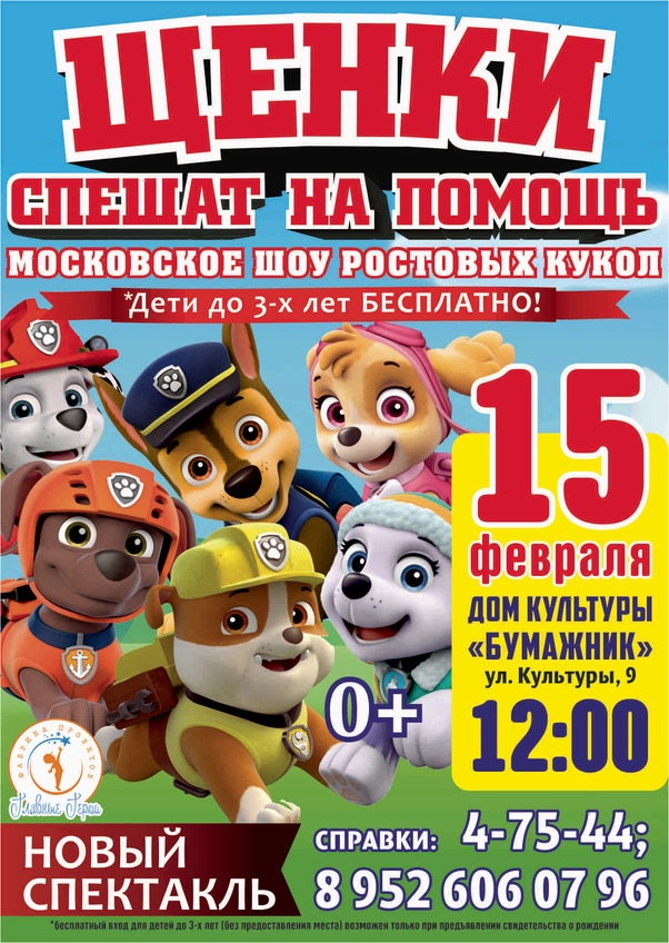 15 февраля в ДК «Бумажник» Московское шоу ростовых кукол представит спектакль «Щенки спешат на помощь».