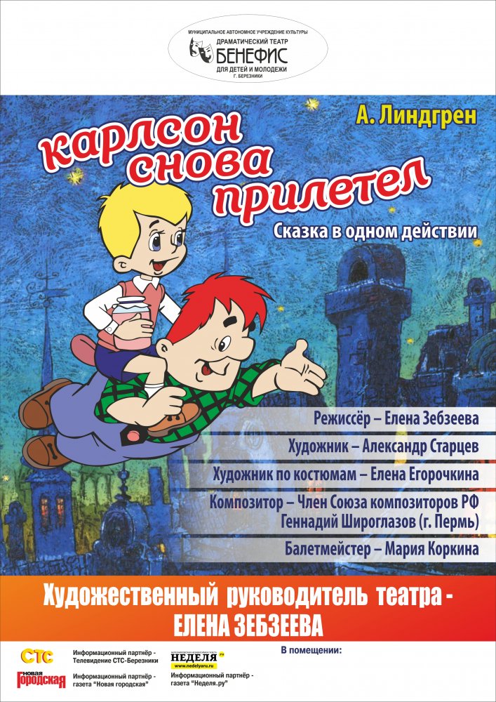Знаменитая сказка Астрид Линдгрен в представлении театра «Бенефис» превратилась в праздник непослушания. Карлсон снова прилетает к Малышу, чтобы навести порядок, поесть плюшек, пропылесосить комнату Малыша, поиграть с ним, выяснить отношения с Фрекен Бок…
