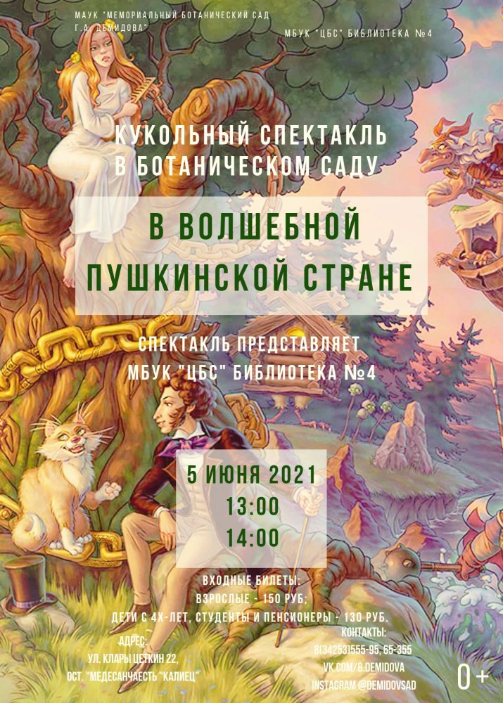 5 июня 2021 Ботанический сад им. Г. Демидова приглашает на кукольный спектакль «В Волшебной пушкинской стране».