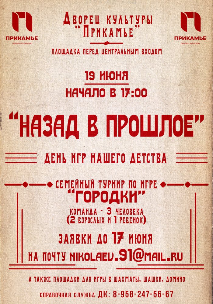 19 июня в ДК Прикамье день игр нашего детства «Назад в прошлое».