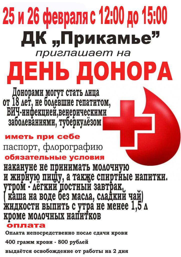 25 и 26 февраля с 12.00 до 15.00 в ДК Прикамье пройдет День донора.