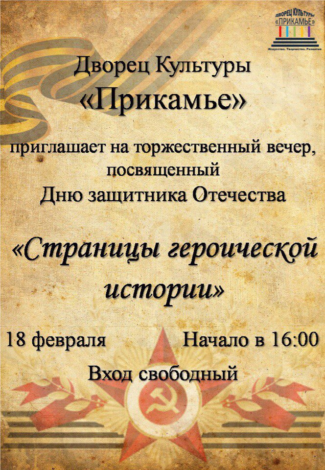 18 февраля в 16:00 в ДК Прикамье состоится торжественный вечер, посвященный Дню защитника Отечества.
