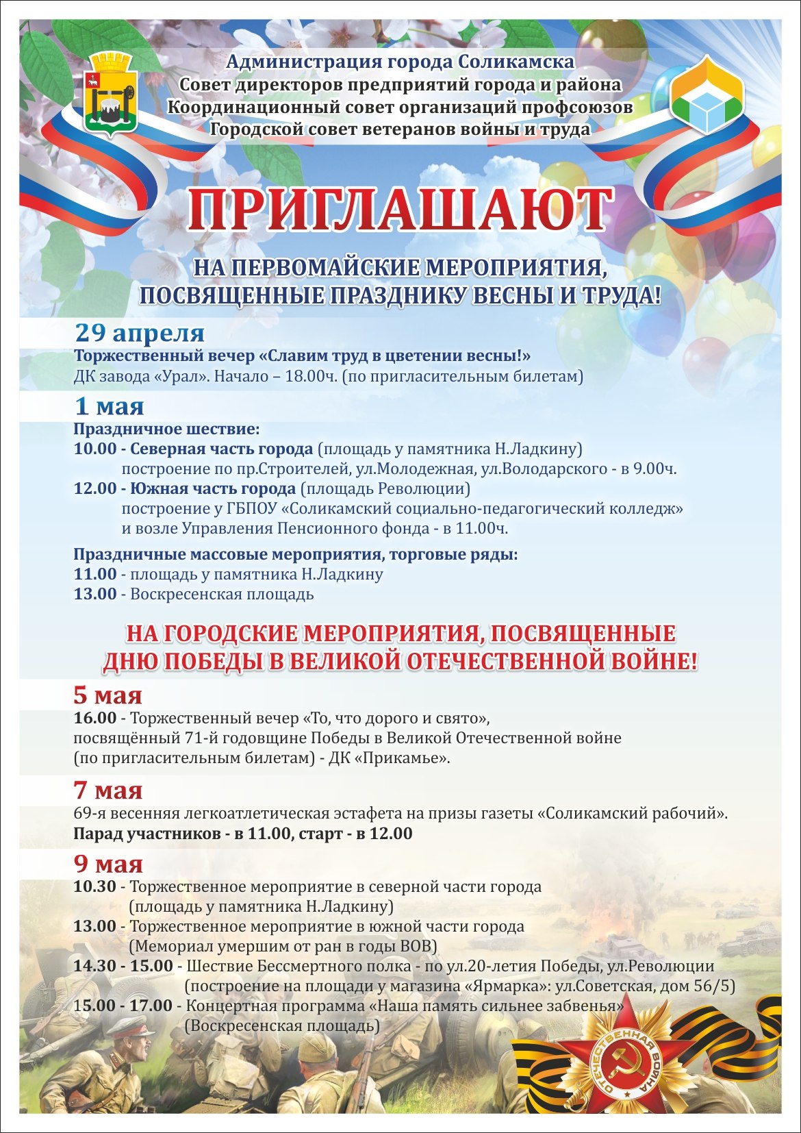 Майские мероприятия, посвященные Празднику весны и труда и Дню Победы, пройдут с 29 апреля по 9 мая.
