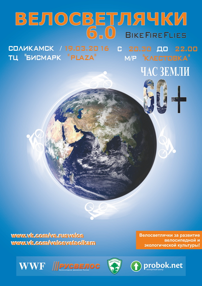 19 марта 2016 года в «Час Земли» в России и городе Соликамске состоится самая масштабная Всероссийская велосипедная акция «Велосветлячки», которая пройдет уже в 6-й раз.