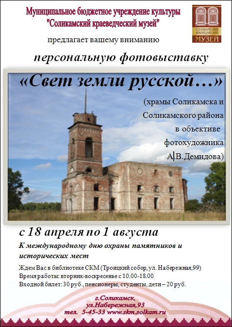 С 18 апреля по 1 августа проходит персональная фотовыставка А.В.Демидова «Свет земли русской...».