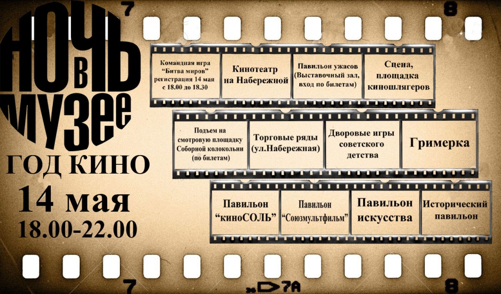 Ночь в музее пройдет 14 мая 2016 года. С 18.00 до 22.00 Тема: Год кино. Место проведения: Художественный музей, Соборная колокольня, ул. Набережная