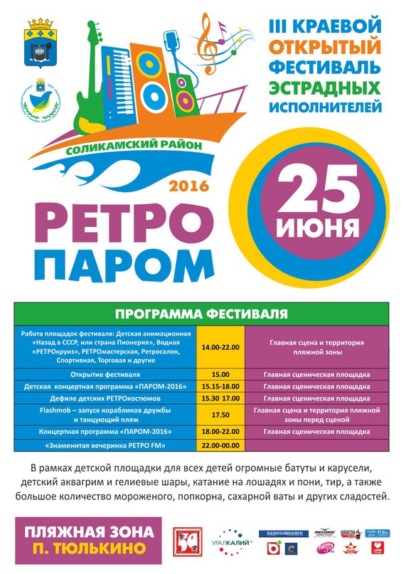 25 июня на территории пляжной зоны в п. Тюлькино Соликамского района в рамках проекта «59 фестивалей 59 региона» состоится III открытый фестиваль эстрадных исполнителей «Паром-2016».