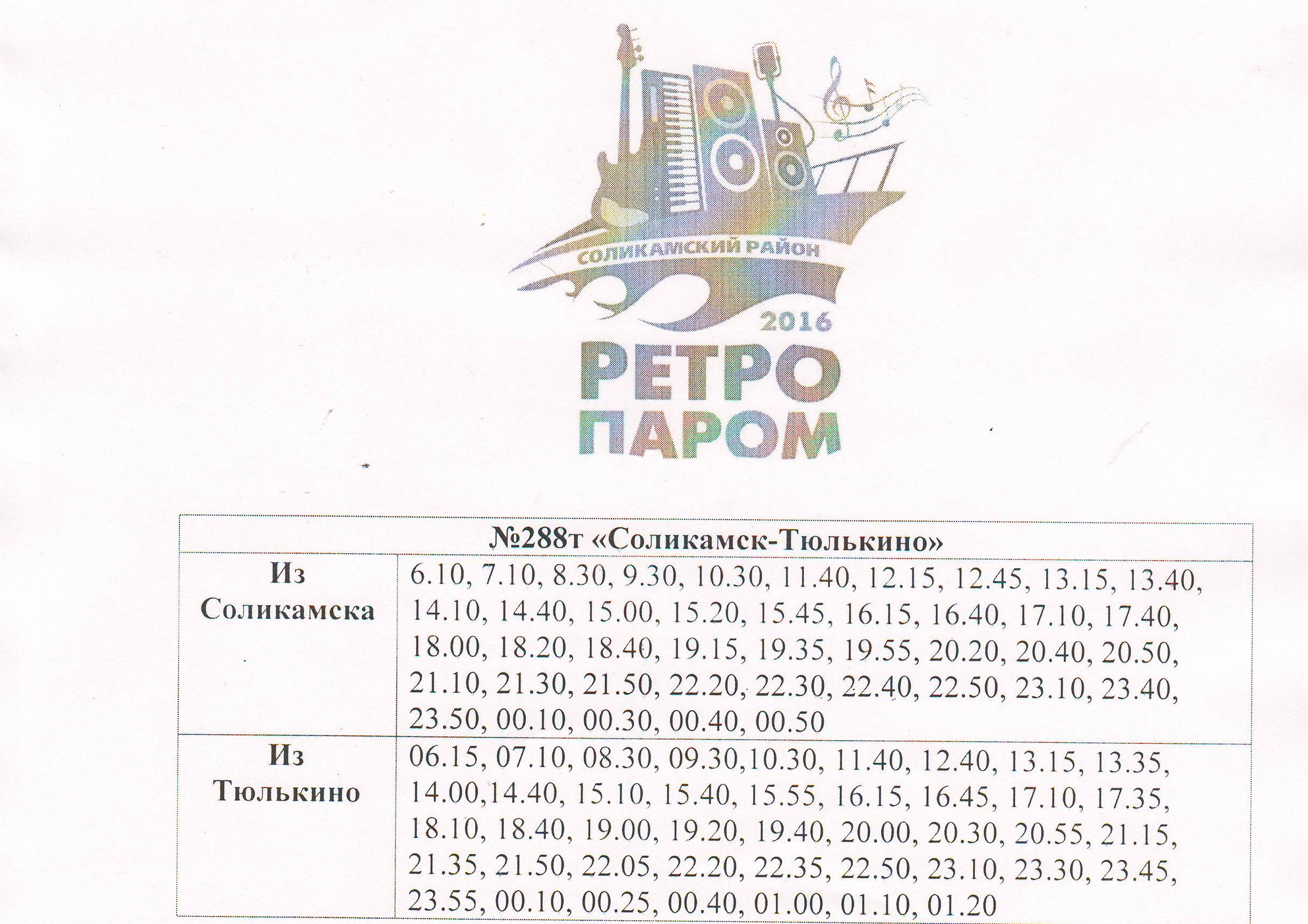 Для удобства гостей фестиваля 25 июня от автостанции г.Соликамска к месту проведения фестиваля будут курсировать дополнительные рейсы автобуса по маршруту № 288 (Соликамск-Тюлькино), о чем будет сообщено дополнительно.