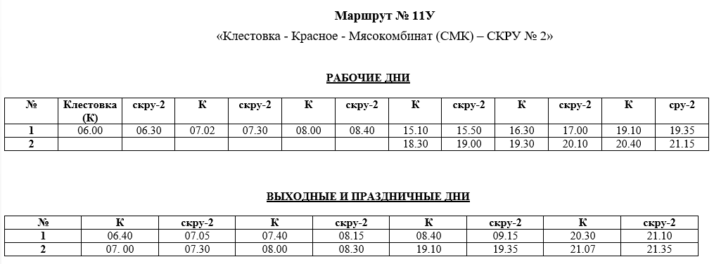 Расписание автобуса маршрута №11У: Клестовка-Красное — Мясокомбинат (СМК)-СКРУ-№ 2