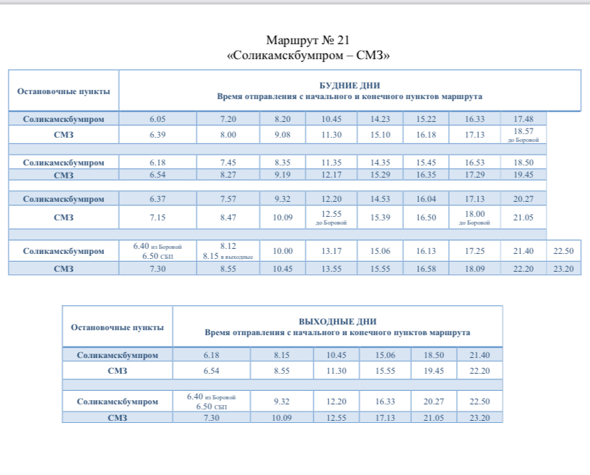 Расписание автобуса маршрута №21: Соликамскбумпром-СМЗ