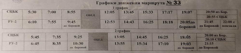 2 график 5:45 7:35 9:25 обед 13:05 14:45 16:25 18:05 20:00 из Бор. 20:10 от СЦБК