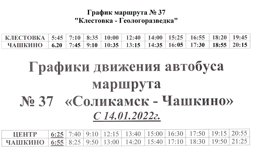 Расписание автобуса маршрута №37: г. Соликамск – п. Геологоразведка