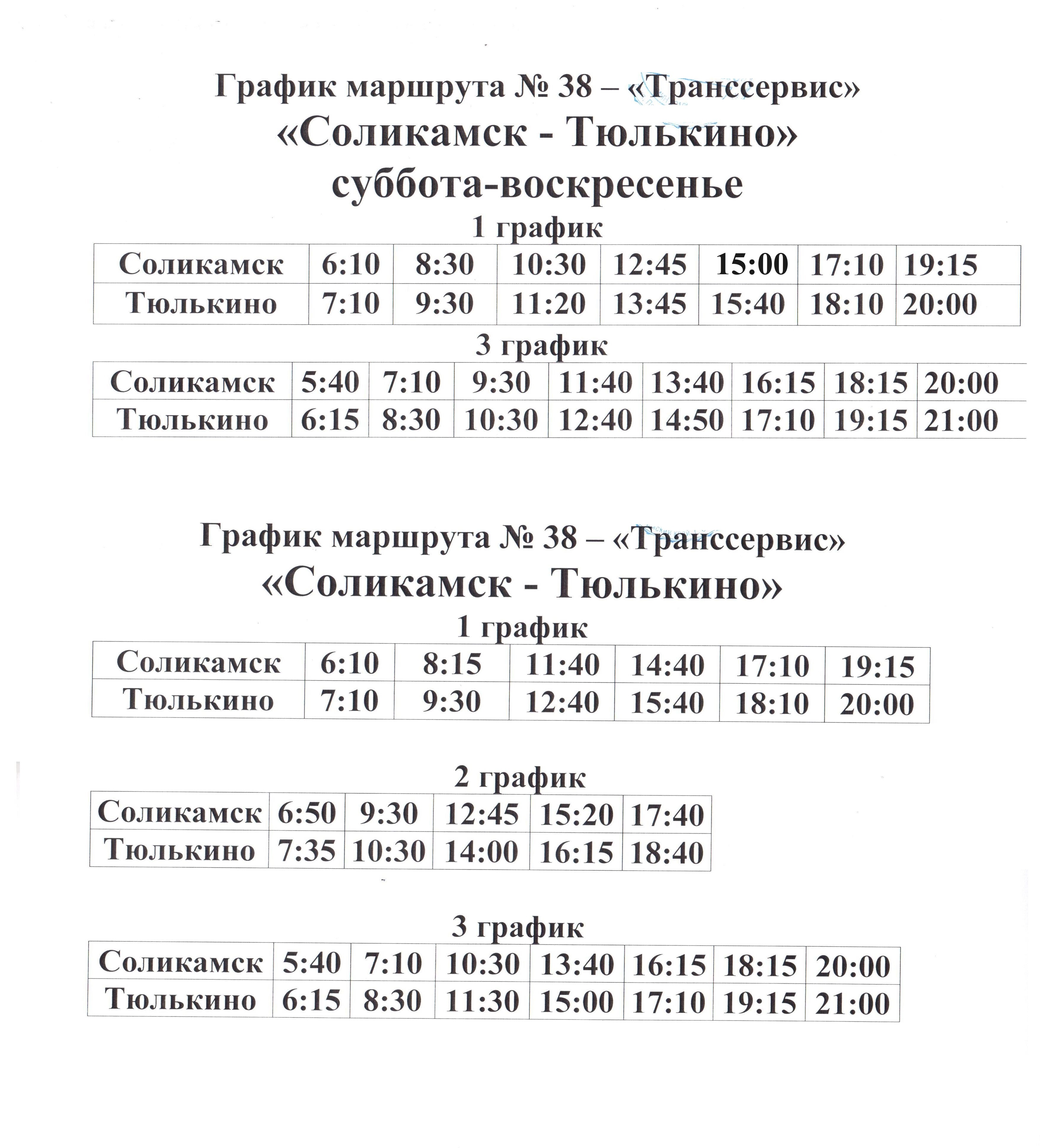 Расписание автобуса маршрута №38 г. Соликамск — п. Тюлькино