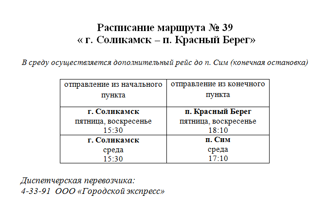 Расписание автобуса маршрута №39: г. Соликамск — п. Красный Берег