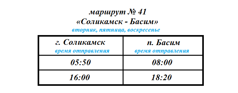 Расписание автобуса маршрута №41: г. Соликамск -пос. Басим